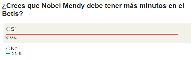 En ella preguntamos sobre si el joven zaguero senegalés debería tener más minutos con el primer equipo visto su debut ante el Alavés y que la otra alternativa de Pellegrini ahora mismo es Sokratis, y una mayoría aplastante apostaría por Mendy antes que por el heleno, en concreto casi un 98% de los votantes creen que Mendy debería tener más minutos. Tan sólo un 2,34% no irían tan rápido con el central del Betis Deportivo.