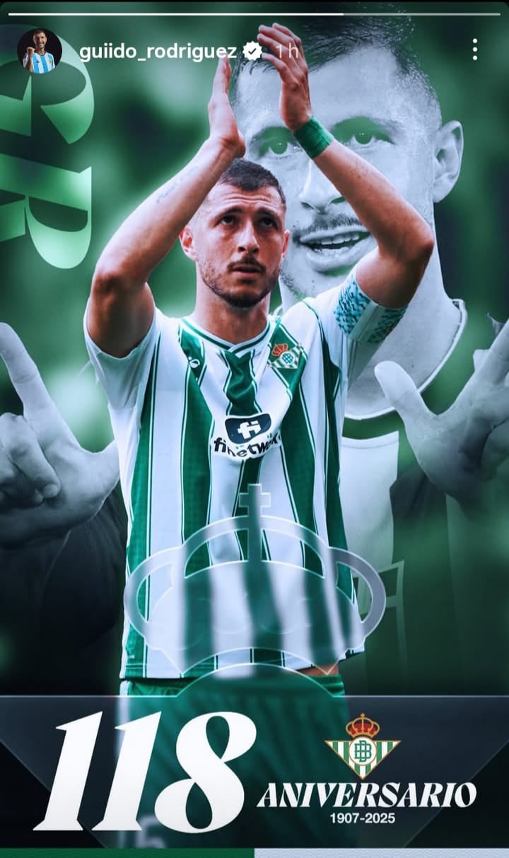Guido Rodríguez no se olvida del Real Betis al cual considera el equipo de su vida en el fútbol europeo. Aunque no salió de la mejor forma posible, después de rechazar varias ofertas de renovación realizadas por el club verdiblanco, el argentino sabe que el Real Betis es el conjunto en el que jugó a mejor nivel y que le permitió obtener un estatus de estrella. Guido Rodríguez está eternamente agradecido al Real Betis y es por ello que no ha dudado en aprovechar el cumpleaños del club verdiblanco, celebra 118 años este viernes 12 de septiembre, para felicitarlo.