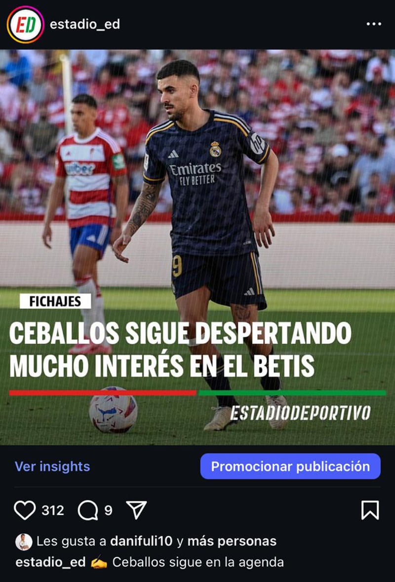 Dani Ceballos nunca se ha escondido a la hora de mostrar su interés de regresar al Betis con numerosos gestos o mensajes al club heliopolitano y al beticismo que dejan claro que estaría encantado de vestir de nuevo la elástica verdiblanca, ya sea con un libro sobre el club de La Palmera antes de coger un avión o interactuando en redes.