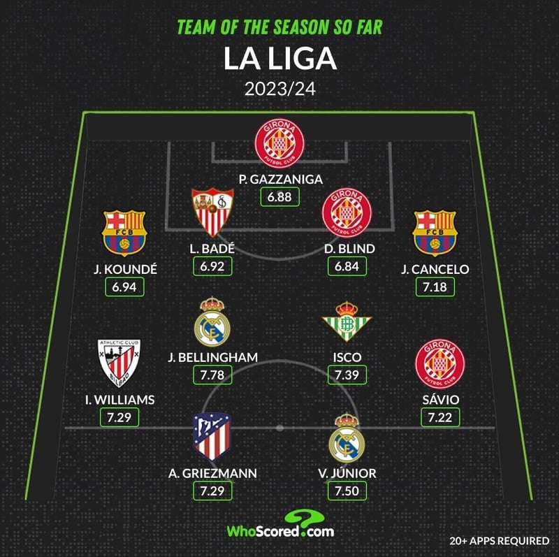 Tres futbolistas del Girona FC, la gran revelación de la temporada 23/24; dos de FC Barcelona y Real Madrid; y uno de Atlético de Madrid, Real Betis, Sevilla FC y Athletic Club conforman el once ideal de LaLiga según @WhoScored, una de las páginas más reputadas y especializadas en la estadística aplicada al fútbol. Esta web, que valora y puntúa las actuaciones de los jugadores conforme a un sinfín de parámetros técnicos y tácticos, entiende que, hasta este parón de selecciones y a falta de ocho jornadas para su epílogo, el mejor promedio bajo palos es para el gironí Paulo Gazzaniga (6,88 sobre 10), mientras que la defensa estaría compuesta por los laterales culés Jules Koundé (6,94) y Joao Cancelo (7,18), con el nervionese Loïc Badé (6,92) y el también gerundense Daley Blind (6,84) como centrales.