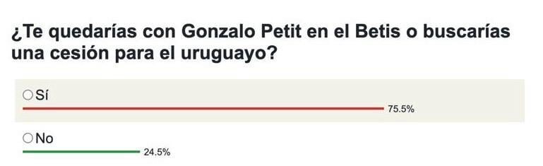 Con la situación del ex de Nacional, en Estadio Deportivo hemos querido sondear con nuestra encuesta Helvetia la opinión del aficionado verdiblanco con respecto a la decisión que tomarían con él. Pues, a pesar de su juventud y de su poca experiencia en la élite, la gran mayoría de los béticos apuestan por quedarse al punta como miembro del primer equipo. Con un arrollador 75,5% los votantes se quedarían con el atacante charrúa en la nómina de delanteros. Tan sólo un 24,5% contemplaría una cesión para que completara su formación y llegara más hecho la próxima temporada.