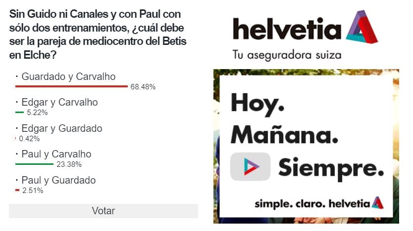 Borja Iglesias, que sigue con su aparatoso vendaje en su recién operada mano derecha, Rodri Sánchez y Paul Akouokou vuelven a una lista sin Guido Rodríguez, que se perderá también el encuentro, en su caso por sanción. El campeón del mundo vio la quinta amarilla el pasado sábado y deberá cumplir ciclo; abriendo así la duda de qué doble pivote alineará Pellegrini entre las diferentes combinaciones que pueden formar entre Paul, Guardado y William Carvalho -Edgar se cayó de las quinielas-.