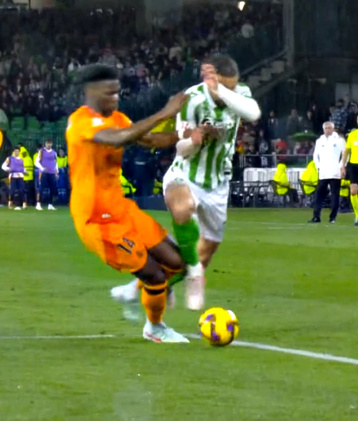 La jugada en cuestión ocurrió en el minuto 70 cuando el Real Betis ya ganaba por 2-1. El equipo entrenado por Manuel Pellegrini dominaba el encuentro a base de posesiones largas lo que hacía sufrir defensivamente a un Real Madrid que, en ocasiones, llegaba tarde a los cortes. Fue así como se produjo la jugada de la polémica. Ricardo Rodríguez se internó en el área llegó antes al balón y fue arrollado por Tchouameni.