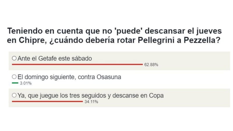 Con todo, es el primer respiro que Pellegrini le da a Pezzella a excepción del partido en Montjüic del pasado 16 de septiembre ante el Barcelona, en la jornada 5 de LaLiga, en el que no tuvo minutos (jugaron Bartra y Riad). El del 1-1 ante el Getafe CF, en el que salió del campo a falta de media hora, fue el primer choque que no juega completo; pues había disputado los 90 minutos en ocho de las nueve jornadas anteriores en LaLiga y en las dos citas en el Grupo C de la Europa League. En total, sin contar sus minutos con Argentina en las ventanas de septiembre y octubre, acumula ya 960 minutos en sus piernas y aún no se ha alcanzado ni un tercio de la temporada.