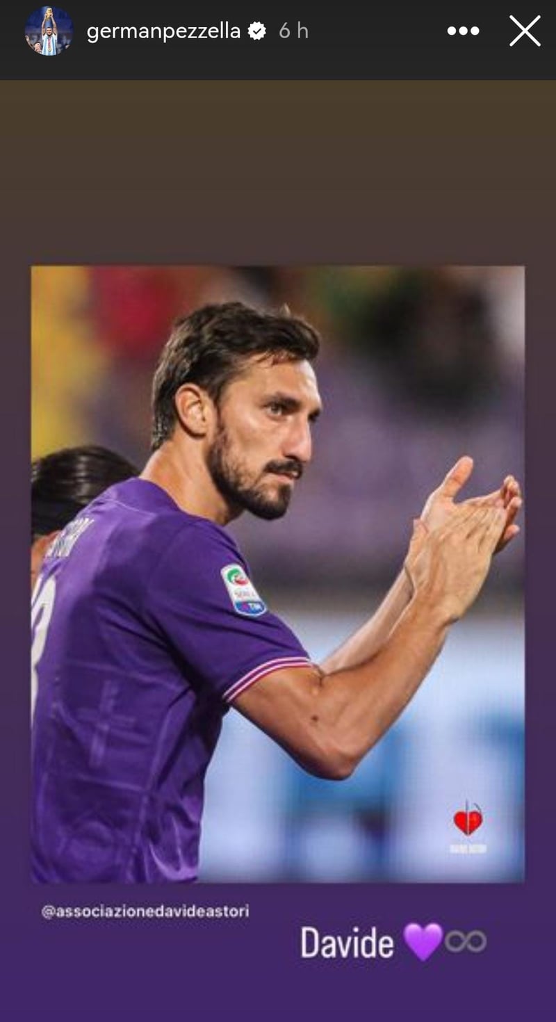 Germán Pezzella ha usado sus redes sociales para subir una foto con la imagen de Davide Astori, quien fue su compañero en la Fiorentina y que falleció el 4 de marzo de 2018 mientras estaba descansando en su habitación de la ciudad italiana de Udine.