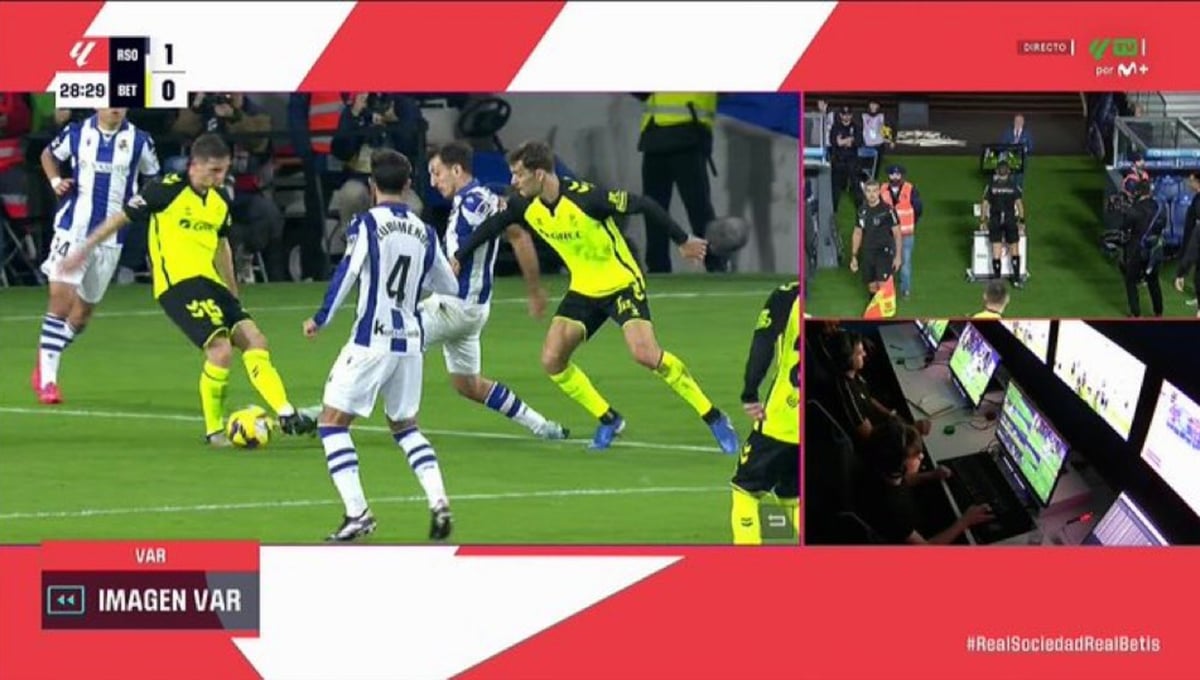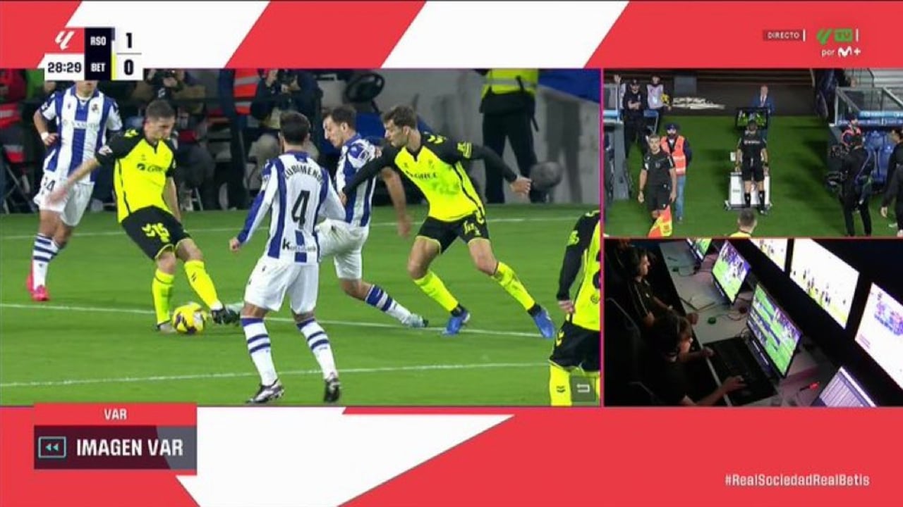 Hasta Manuel Pellegrini protestó y se llevó la primera tarjeta amarilla del partido por la acción que derivó este domingo en el 2-0 en Anoeta, que acercaba el segundo triunfo consecutivo en partido oficial de la Real Sociedad y la tercera derrota seguida del Real Betis. Al principio, Hernández Maeso no había apreciado nada punible en la caída dentro del área visitante de Mikel Oyarzabal, pues parecía que Romain Perraud despejaba sin mayores problemas el balón, pero Del Cerro Grande avisaba a su compañero desde la sala VOR de que estaban revisando la acción por un posible contacto. El toque del francés en el costado del autor del tanto que dio a España su cuarta Eurocopa no se antojaba suficiente, pero las repeticiones demostraron que existe un toque, aunque bastante leve, entre los pies izquierdos de ambos. Como quiera que el capitán local puntea la pelota justo antes, la pena máxima era la consecuencia esperada.