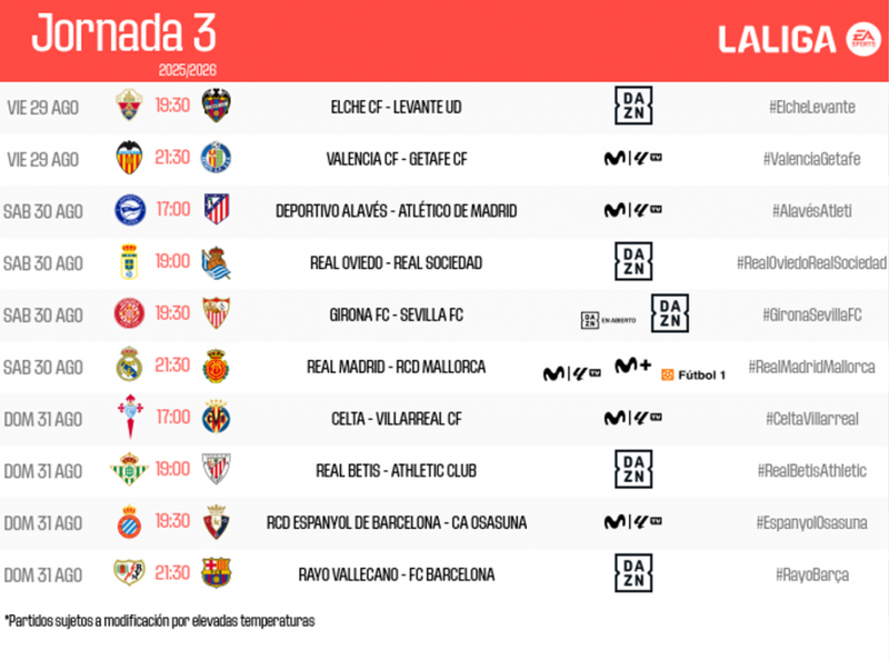 Si LaLiga ha sido consecuente a la hora de fijar los horarios de las dos primeras jornadas del curso 25/26, la primera desfachatez ha llegado este lunes al dar a conocer la franja de la tercera en lo que respecta al Real Betis. De esta forma, los de Manuel Pellegrini se estrenarán el lunes 18 de agosto a las 21:30 horas en el Martínez Valero ante el recién ascendido Elche CF, mientras que el debut en el Estadio de La Cartuja será a las 21:30 horas del viernes 22 de agosto contra el Deportivo Alavés en previsión de que el duelo de la sexta contra el RC Celta de Vigo en Balaídos se reubique el miércoles 27-A, ya que no podrían enfrentarse en la jornada intersemanal al jugar ambos el jueves 26 de septiembre la primera entrega de la Europa League. Hasta aquí, todo correcto. El problema ha llegado cuando la patronal de los clubes españoles ha publicado el reparto para la última fecha del mes venidero.