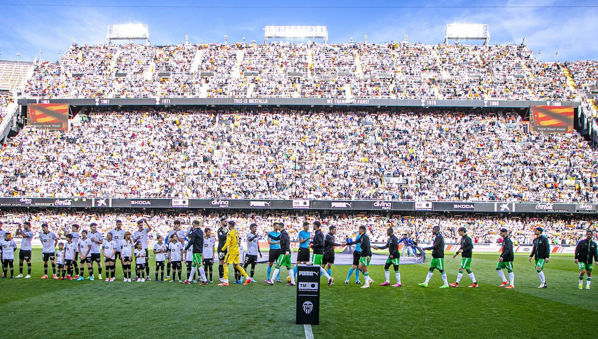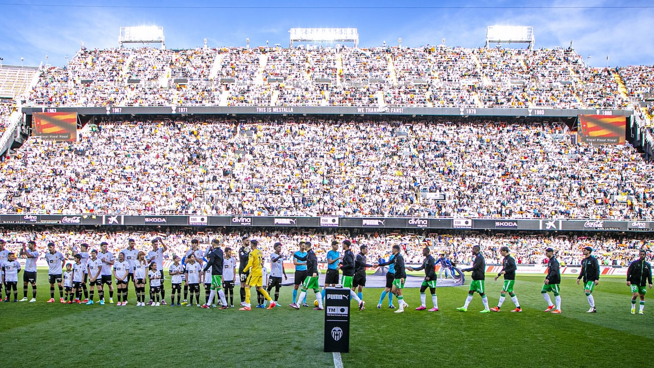 El saludo entre ambos equipos en los prolegómenos del duelo en Mestalla.VCF