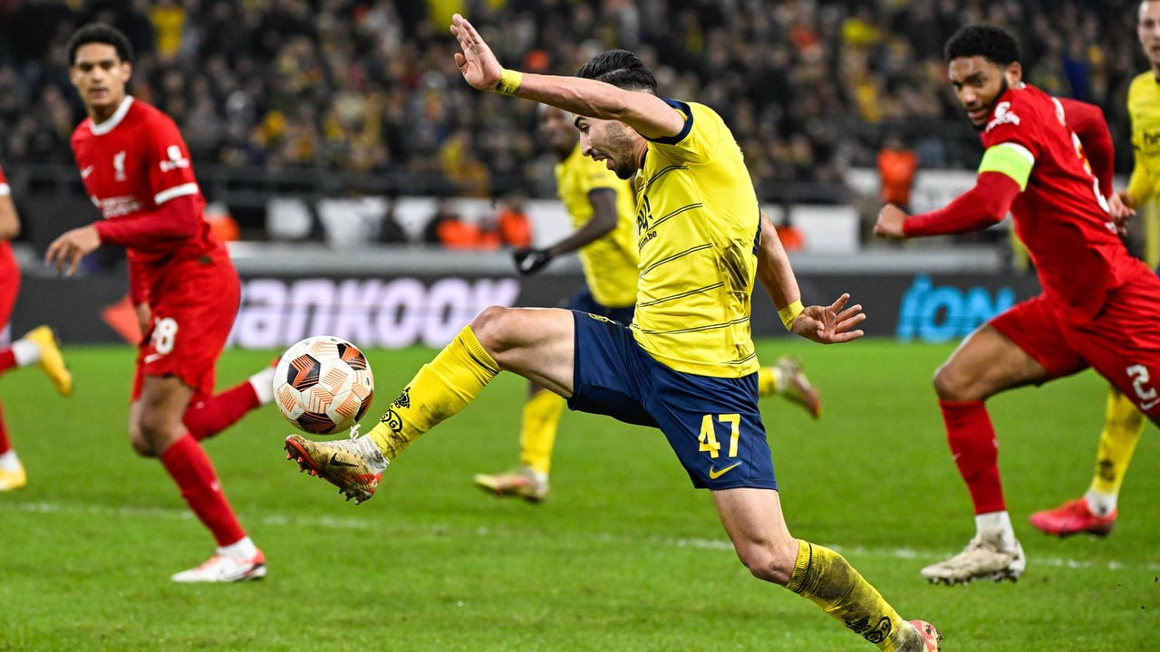 Mohamed Amoura (23), en la Copa de África con Argelia actualmente, controla un balón durante un Royale Union Saint-Gilloise - Liverpool de la UEL.CORDON PRESS
