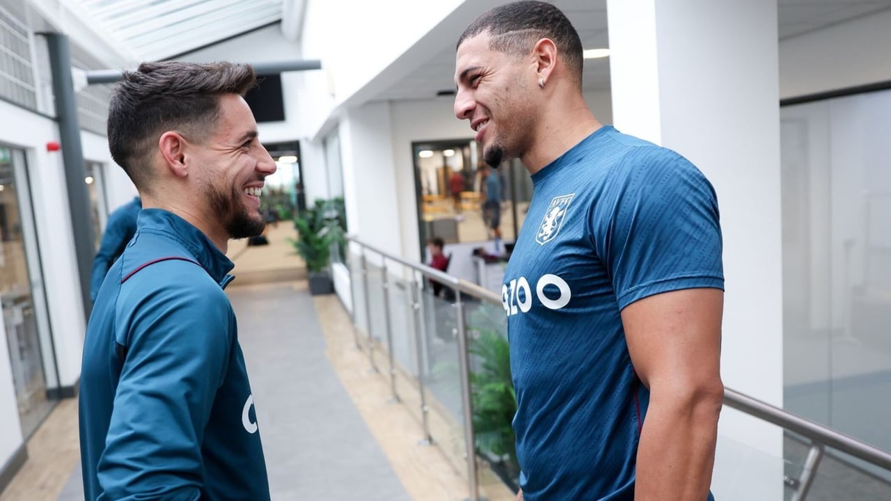 Álex Moreno saluda a Diego Carlos en su primer día como 'villano'.AVFC