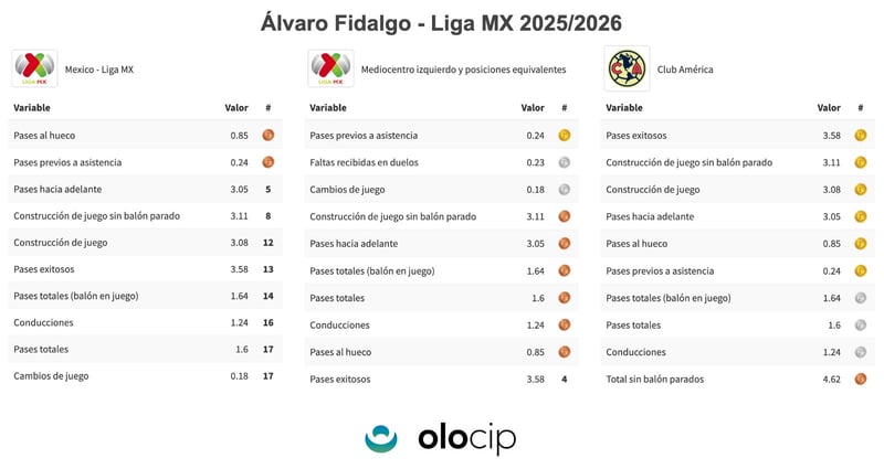 Del mismo modo, como puede verse en el gráfico remitido a ESTADIO Deportivo por Olocip, se encuentra en el podio de construcción de juego, pases hacia adelante, pases totales, conducciones y pases al hueco. Es más, en el global de todos los futbolistas del campeonato azteca, está el tercero en 'preasistencias' y en balones filtrados.