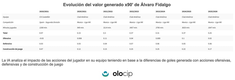 Lo más llamativo de todo es que, a pesar de ser estadísticas muy óptimas, en esta 25/26 incluso ha estado un pelín por debajo de la incidencia que venía mostrando en las últimas campañas tan exitosas para el Club América -22 goles y 30 asistencias en 227 partidos oficiales-. La Inteligencia Artificial también pone el foco en las principales líneas de evolución de Álvaro Fidalgo, desde que salió en la 2020/2021 de un CD Castellón entonces en LaLiga Hypermotion y a lo largo de estos casi seis cursos como jugador crema.