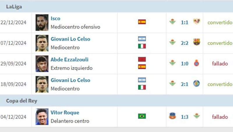 El Betis ha tirado cinco penaltis en lo que va de temporada 24/25 y ha usado cuatro lanzadores con un índice de acierto muy dispar. Lo Celso es el único que ha repetido y de momento ha metido los dos: asumió la presión en el primero de todos, el 18 de septiembre ante el Getafe CF (victoria por 2-1), y también acertó el 7 de diciembre contra el FC Barcelona (2-2). Entre medias, el 29 de septiembre cedió el lanzamiento ante el RCD Espanyol (triunfo 1-0) a Abde, quien volvió a fallar tras errar el que tuvo a finales del curso pasado contra la Real Sociedad. El otro, el 4 de diciembre en Copa del Rey ante el UE Sant Andreu (1-3), lo desperdició Vitor Roque sin que hubiese polémica porque Gio ya había sido sustituido. La lista se cierra con el mencionado disparo de Isco ante el Rayo Vallecano (1-1).
