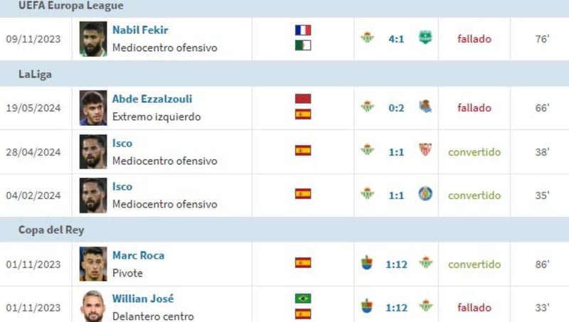 El curso pasado, el índice de acierto desde los once metros también fue muy bajo: tres goles de seis intentos. Isco Alarcón lanzó dos (sendos 1-1 ante Sevilla y Getafe) y los dos acabaron dentro de la portería; también acertó el suyo Marc Roca (1-12 al Hernán Cortes), pero Willian José falló otro en ese mismo duelo copero en Extremadura, Nabil Fekir marró en un choque de Europa League ante el Aris Limassol (4-1) y en la penúltima jornada Ez Abde lo ejecutó muy mal en un duelo directo ante la Real Sociedad (0-2 en casa).
