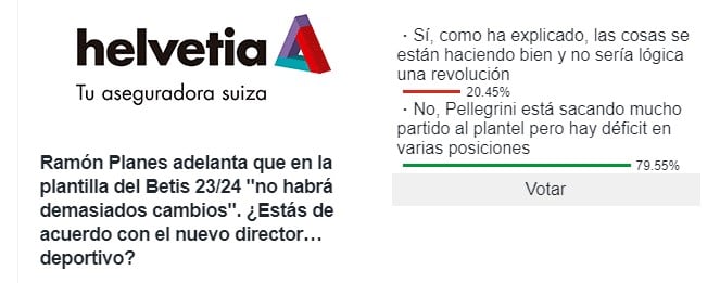 Un mensaje que no ha llegado a ilusionar a la afición verdiblanca, aunque confíe en el nuevo mandamás de la dirección deportiva. Pero si hay algo que gusta a la afición y más en verano, eso son los fichajes, las caras nuevas y que tanta expectación generan a su llegada. Por eso mismo, los resultados de nuestra #EncuestaHelvetiaED van por ese camino. Preguntamos si la afición estaba de acuerdo el mensaje enviado por el director deportivo en cuanto a los pocos cambios que habrá y casi el 80% de la afición no se alinea con ese discurso.