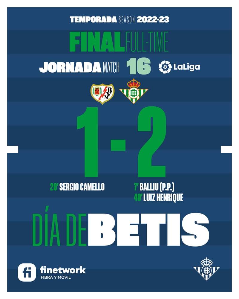 Victoria trabajada del Real Betis, que suma ya dos en otros tantos partidos de 2023. Remontaron en Copa del Rey los de Manuel Pellegrini para plantarse en octavos y, rememorando el 1-2 del torneo del K.O. en las semifinales de la pasada edición, celebraron nuevamente en Vallecas, esta vez en LaLiga, para dar un golpe en la mesa en la lucha por la Champions. Un autogol de Balliu puso pronto por delante a los visitantes, pese a no ser mejores que su anfitrión, por lo que pronto llegaría el empate de Camello, aunque la reacción previa al descanso, coronada con un golazo de Luiz Henrique, bastó para encauzar un triunfo que pudieron sellar Canales y Rodri, con sendos disparos al larguero, aunque el VAR lanzó un guiño anulando el que habría sido 2-2 de Isi Palazón.