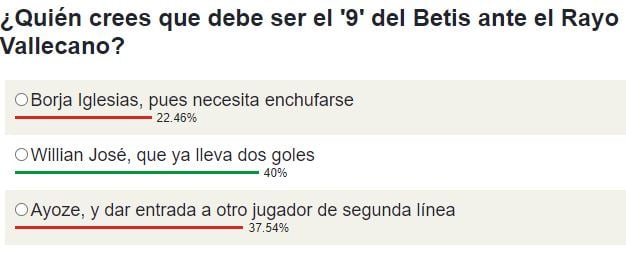 Ante esta situación, y de cara al partido ante el Rayo, la web de www.estadiodeportivo.com ha trasladado a sus lectores este debate del '9' del Betis en la #EncuestaHelvetiaED. El resultado coincide un poco con el aire que se respira en otros foros y Willian José es el que recibe más apoyo. Con un 40 por ciento de los votos, supera a la que el curso pasado era el 'Plan B' de Pellegrini: colocar a Ayoze como punta dando entrada a otro jugador de la segunda línea ofensiva. La opción de adelantar al tinerfeño la marcaron un 37,45 por ciento; mientras que la necesidad de enchufar a Borja quedó como tercera vía preferida con un 22,4%.