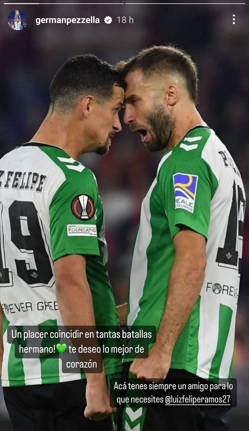 "Te echaremos de menos, hermano. Te deseo lo mejor en todo lo que viene. Eres un fenómeno", eran las palabras de despedida de otro referente del vestuario del Betis como es Borja Iglesias. "Mucha suerte, amigo. Eres top", le escribía Aitor Ruibal; mientras que uno de los más expresivos ha sido su compañero en el eje de la zaga heliopolitana, Germán Pezzella: "Un placer coincidir contigo, hermano. Te deseo lo mejor de corazón. Acá tenés un amigo para lo que necesites". A ellos, desde la distancia al otro lado del 'charco', no quiso faltar a la cita Sergio Canales: "Mucha suerte, amigo. Te mereces lo mejor".