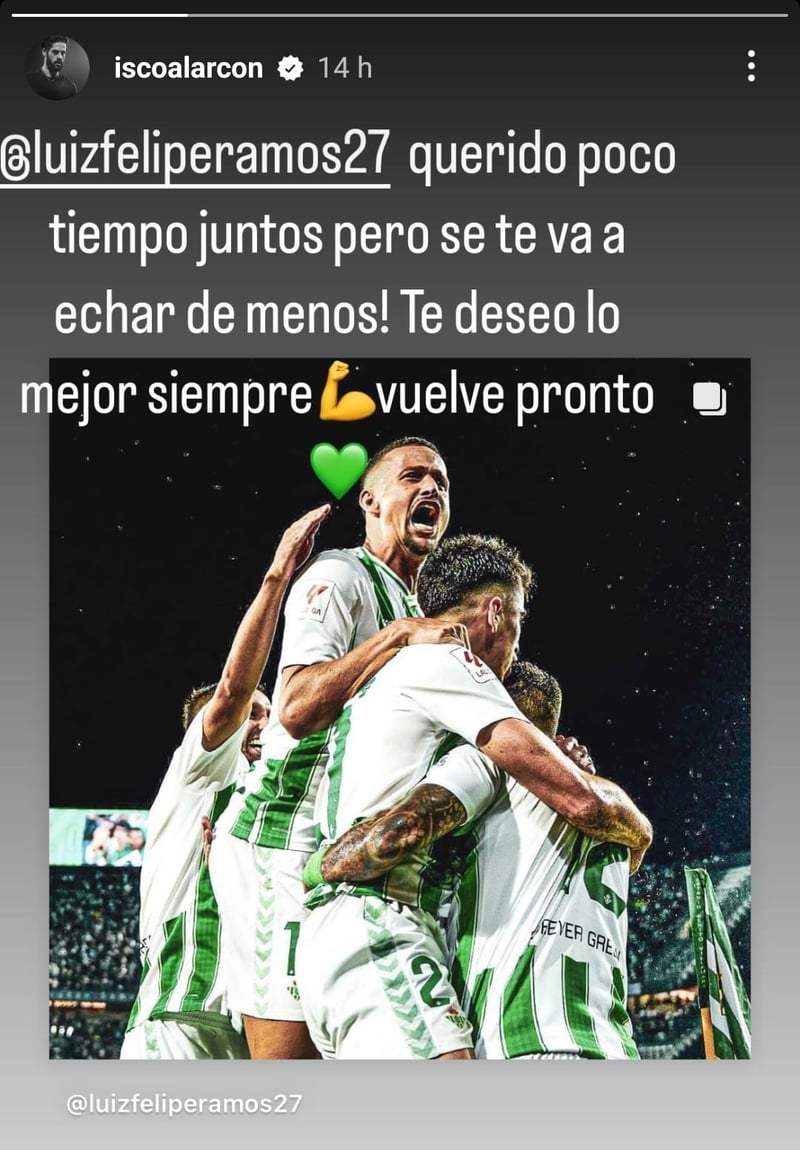 Uno de los más expresivos a la hora de despedirse de Luiz Felipe ha sido, curiosamente, uno de los que menos tiempo ha podido compartir con él. Isco Alarcón sólo ha coincidido con el internacional italiano poco más de un mes; pero le ha dejado huella. "Querido, ha sido poco tiempo juntos, pero se te va a echar de menos. Te deseo lo mejor siempre. Vuelve pronto", le decía el mediapunta malagueño, con una imagen de una alocada celebración del nuevo zaguero del Al-Ittihad. Este verano han vuelto Bellerín, Bartra y Ayoze, por lo que pensar en un regreso a corto o medio plazo no resulta tan descabellado.