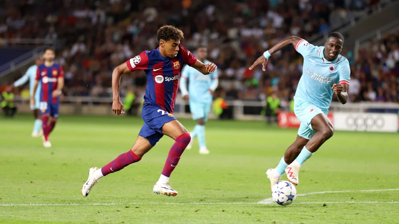 Soumaïla Coulibaly trata de frenar el avance de Lamine Yamal durante el Barcelona-Royal Amberes de la Champions.CORDON PRESS