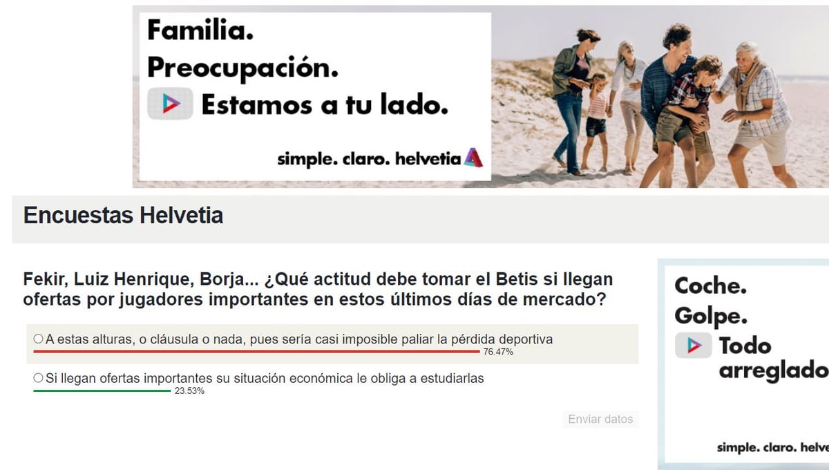 En cualquier caso, si el Betis quisiese hacer alguna operación importante de este tipo no habría esperado al día 26 de enero, a falta de poco más de cinco días para el cierre del mercado. Pese a ello, el temor está ahí. Preguntados en este sentido en la #EncuestaHelvetiaED, un 76,5% por ciento de los lectores de ESTADIO Deportivo que han participado en el sondeo abogan por exigir 'cláusula o nada', por la dificultad de sustituir la enorme pérdida deportiva. El 24,5% restante entiende la realidad económica del club y, muy a su pesar, asume que si llegan ofertas importantes, está obligado a estudiarlas y puede que hasta tenga que aceptarlas.