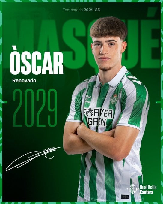 "El Real Betis Balompié y Òscar Masqué han alcanzado un acuerdo para la renovación del jugador por cuatro campañas más. Así, el lateral se ha vinculado hasta 2029 con la entidad verdiblanca. Òscar Masqué García (Cabrianes, Barcelona, 15 de enero de 2007) aterrizó en Heliópolis en verano de 2022. Tras su paso por el cadete A del Real Betis y la cesión al Calavera CF, el lateral diestro ha ofrecido un gran rendimiento en el Juvenil División de Honor, con quien se ha convertido en campeón de liga y de la Copa de Campeones con una asistencia en la final", ha anunciado el club verdiblanco, recordando su flamante condición de internacional y deslizando que tiene todas las papeletas para quedarse en el Betis Deportivo en esta 25/26 saltándose al recién ascendido Betis C.