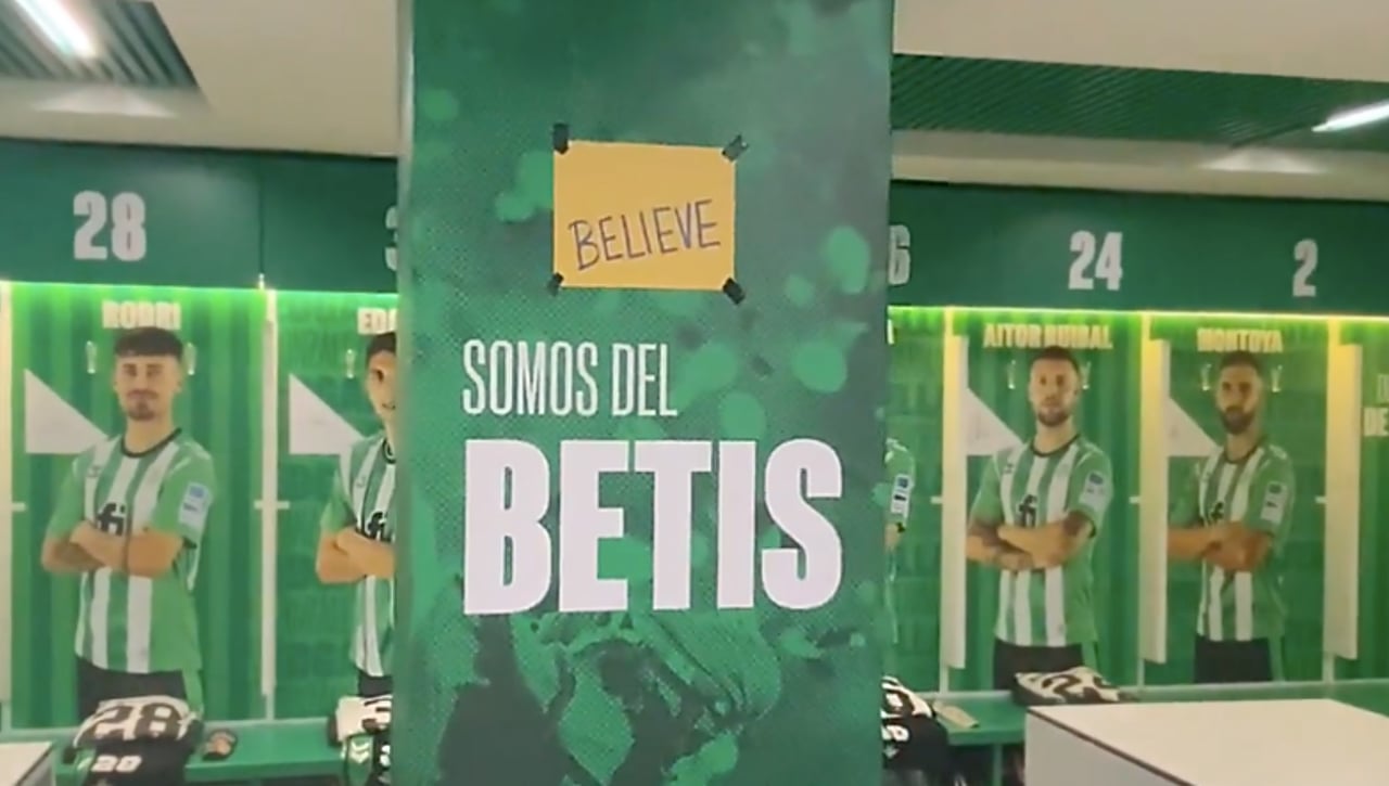 El Real Betis tiene claro su mensaje de esta noche para la vuelta de los octavos de final de la UEFA Europa League. Al igual que hiciera Ted Lasso a su llegada a la Premier (hablamos de una serie de televisión), los verdiblancos han pegado en su vestuario un cartel que deja bien claro cómo afrontan el partido ante el Manchester United por una plaza en los cuartos de final de la competición continental. En el centro, donde todos lo puedan leer, aparece la palabra 'Believe' (creer).