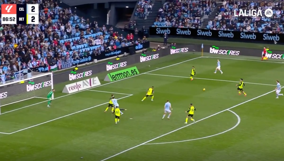 En Vigo, fue el único cambio respecto al once que se midió con el Athletic Club, dejando su sitio a Marc Roca. Con todo, Manuel Pellegrini recurrió a Sergi Altimira todavía con 0-2 en el marcador y con más de media hora de juego por delante. No tuvo su mejor actuación el '16', retratado en las imágenes del 3-2 definitivo, cuando vuelve al trote en el contragolpe del RC Celta y ve cómo Williot Swedberg se posiciona a pocos metros para remachar el centro de Sergio Carreira. Pese a que en un principio hace ademán de acelerar, se contiene para dejar al sueco tranquilamente que le pegue de primeras antes de que Ángel Ortiz, en su intento de interponerse, desvíe muy a su pesar contra su propia portería, engañando a Adrián San Miguel. Un 'palo' en el minuto 87 que, sin ser obviamente achacable del todo al ex azulón (Ricardo Rodríguez no representa ninguna oposición al carrilero local en su centro), sí le otorga cierta responsabilidad.