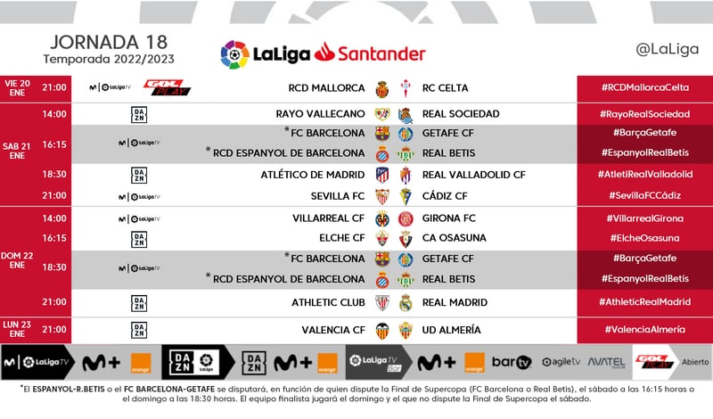 El calendario se comprime en este mes de enero con hasta tres competiciones, de, y más aún para los clubes que tienen que disputar la 'final four' en Arabia Saudí la próxima semana, Real Betis, FC Barcelona, Real Madrid y Valencia. En el día de hoy, LaLiga ha dado a conocer los horarios de una nueva jornada de LaLiga, la decimoctava, que se disputará el penúltimo fin de semana de enero.