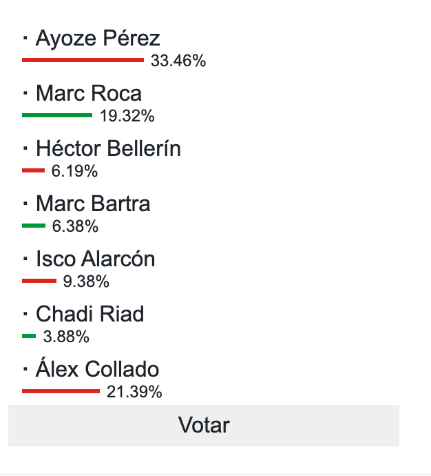 El extraño fichaje de Collado por el Betis y la certeza de que difícilmente luzca el escudo de las trece barras, al menos esta campaña, al erigirse la entidad de La Palma en una especie de 'reseller' de la catalana, no es óbice para que los participantes en la encuesta propuesta por ESTADIO Deportivo lo hayan elegido, con un 21,39% de los votos, en la segunda llegada más ilusionante del verano, solamente por detrás de Ayoze Pérez (33,46%) y por delante de Marc Roca (19,32%). A más distancia quedan Isco Alarcón, Marc Bartra, Héctor Bellerín y Chadi Riad.