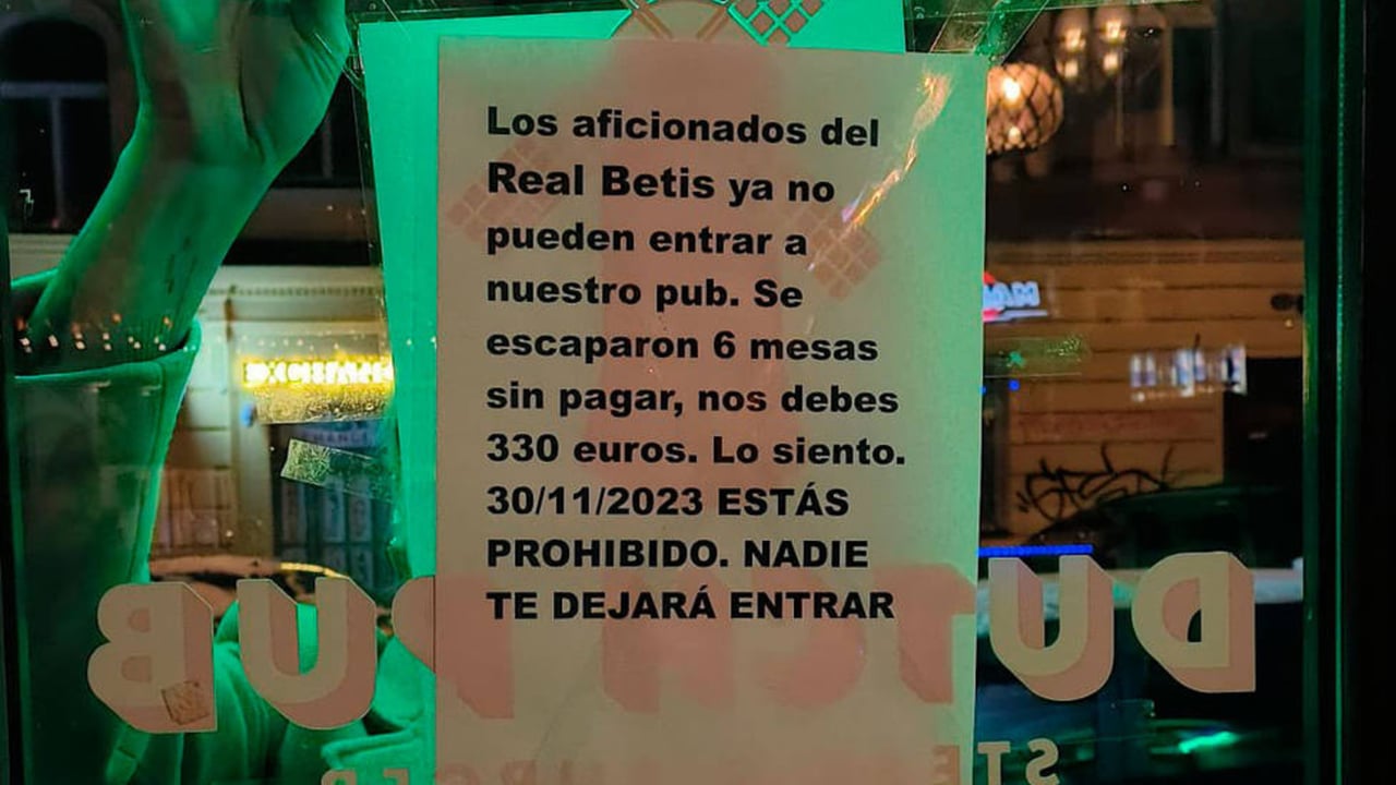 La imagen del Real Betis estaba en juego y, aunque no tenía ninguna obligación, su consejo de administración ha estado a la altura. Muchos aficionados verdiblancos desde la distancia afeaban que otros iguales sacaran pecho por el 'simpa' de seis mesas de clientes del Dutch Pub de Praga, que se marcharon en la víspera del partido sin pagar y dejaron una 'roncha' de 330 euros, según denunciaba en sus redes sociales el establecimiento. Para evitar problemas de similar calado, el bar prohibió la entrada a todo aquel que simpatizara con los heliopolitanos, especialmente este jueves, cuando emitieron en sus pantallas el encuentro correspondiente a la quinta jornada del Grupo C de la Europa League, en el que el Sparta acabó imponiéndose por 1-0. Además, en perfecto español, los dueños colgaron un cartel en la puerta del local explicando la fechoría y el porqué del veto.