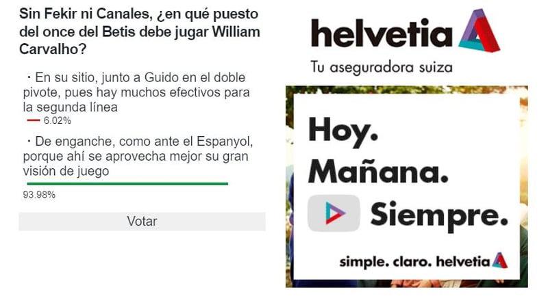 El mejor del partido, sin duda, y así también lo piensa la afición del Real Betis, que si por ella fuera no sacaría de esa posición de enganche a Carvalho mientras dure la sanción de Canales. Un 94% de los votantes en nuestra #EncuestaHelvetiaED apostaría por el luso por detrás de Borja Iglesias, mientras que tan solo un 6% lo ve algo puntual y lo prefiere en el doble pivote junto a Guido para dejar el enganche a otro futbolista de ataque.