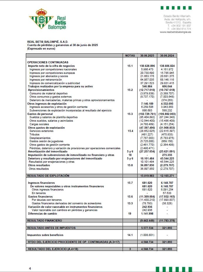 En lo referente al dinero desembolsado, el Real Betis ha logrado reducir los gastos de personal en cerca de 6 millones de euros (de 109 a 103 millones), destacando una rebaja de algo más de dos millones en los salarios de la plantilla (de 87,2 a 85,4 m.), a pesar del enorme esfuerzo en el mercado estival de fichajes para cuadrar operaciones como la de Antony dos Santos. Asimismo, los gastos financieros se redujeron también en más de seis millones de euros y el resultado de explotación tuvo un saldo positivo de 15 millones de euros (era de +12 en el ejercicio 23/24).
