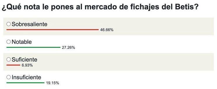 En Estadio Deportivo hemos querido sondear la opinión de la afición del Betis respecto al mercado de fichajes realizado por los suyos. Manu Fajardo se ha ido ganando poco a poco el trato de favor de gran parte de la afición desde el fichaje de Antony el pasado invierno y las buenas incorporaciones de este verano han seguido ampliando su buena fama. La respuesta de la afición bética a la nota para el mercado ha sido mayoritariamente de sobresaliente con un 46,66%. Tan sólo un 19,15% suspendería la actuación de la dirección deportiva mientras que el resto estarían entre el aprobado justito y el notable.