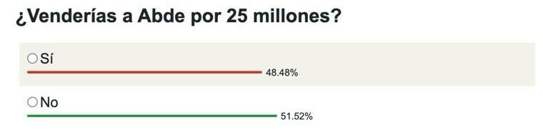 En Estadio Deportivo hemos querido preguntar a la afición bética por su opinión sobre el precio de salida del internacional por Marruecos. La respuesta de los béticos ha quedado prácticamente igualada, pero ha ganado la opción de no venderlo por esa cantidad. El 51,52% no traspasaría al extremo por 25 millones de euros, mientras que el 48,48% restante sí lo haría. El tramo final de la última temporada, con dos goles ante la Fiorentina y marcando también en la final ante el Chelsea, han subido el caché de Abde entre la afición bética, que ahora lo considera un valor importante de la plantilla.
