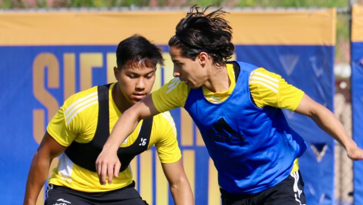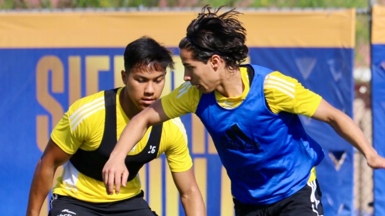 Diego Lainez (a la derecha, con peto azul), durante un entrenamiento con el Tigres.@TigresOficial