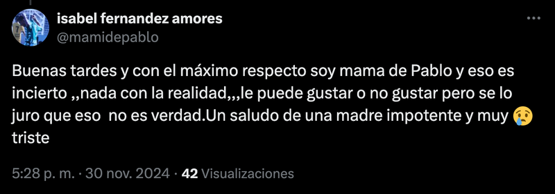 Mientras la agencia que representa al extremo, Promoesport Andalucía, no sale de su asombro y prefiere rebajar la tensión, considerando este movimiento una parte de las negociaciones, pero también un gesto feo e innecesario, el club sigue esperando una respuesta para rubricar la ampliación deseada. Pablo García está triste y no se pronuncia, ni públicamente ni en privado, desde el pasado miércoles, al tiempo que su padre, Ramón García, bético hasta la médula como el zurdo y muy activo en redes sociales, se ha limitado a retuitear una frase de Luis de la Fuente, seleccionador nacional absoluto, en la que éste defiende que "a toda persona que trabaja, que se deja la piel, la vida te da recompensa. Si trabajas y eres honesto, la vida siempre te devuelve algo nuevo". La madre del atacante, Isabel Fernández Amores, salía al paso de alguna crítica y confesaba sentirse "impotente y muy triste", además de recomendarle "cabeza alta" y "trabajo, trabajo y más trabajo".