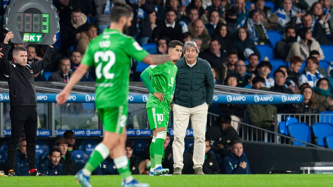 El 'Ingeniero' habla con el atacante canario mientras el '22' camina en primer plano durante el Real Sociedad - Real Betis.CORDON PRESS