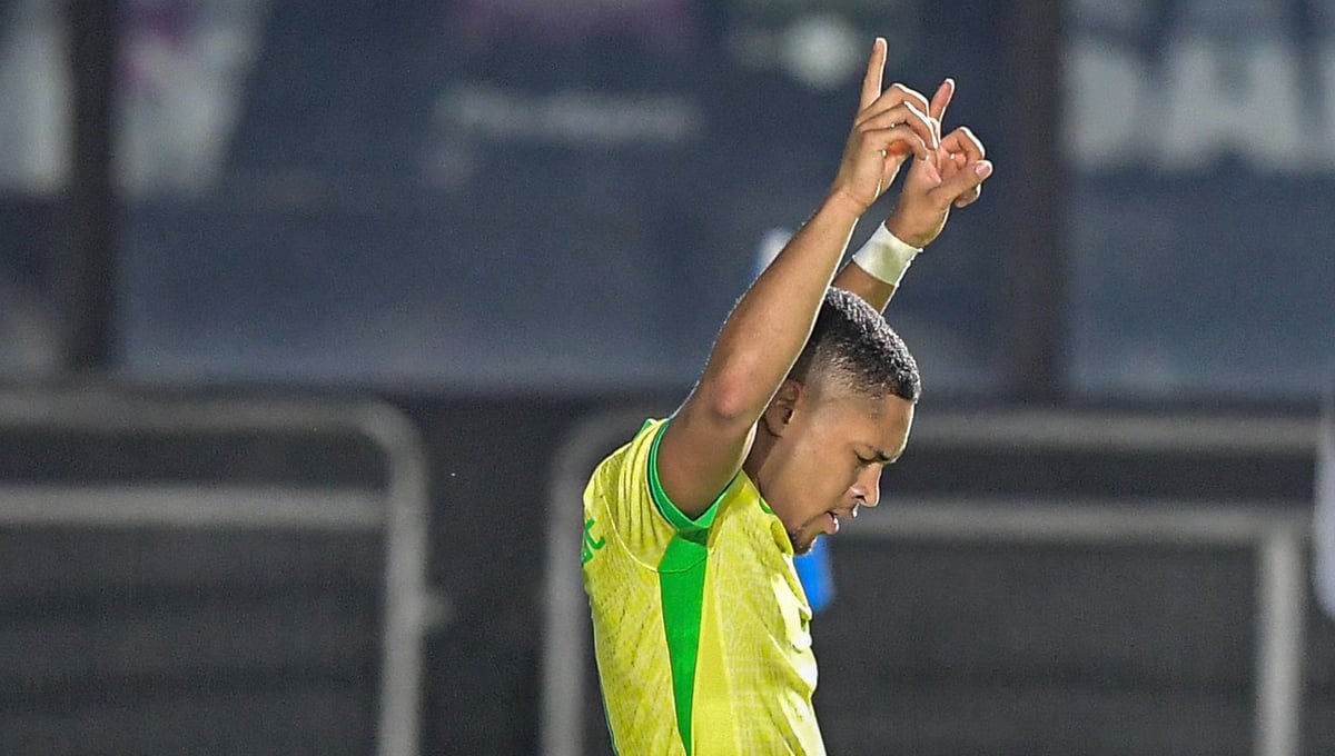 El de Timóteo celebra su doblete con la sub 20 de su país ante México.@vitor_roque9