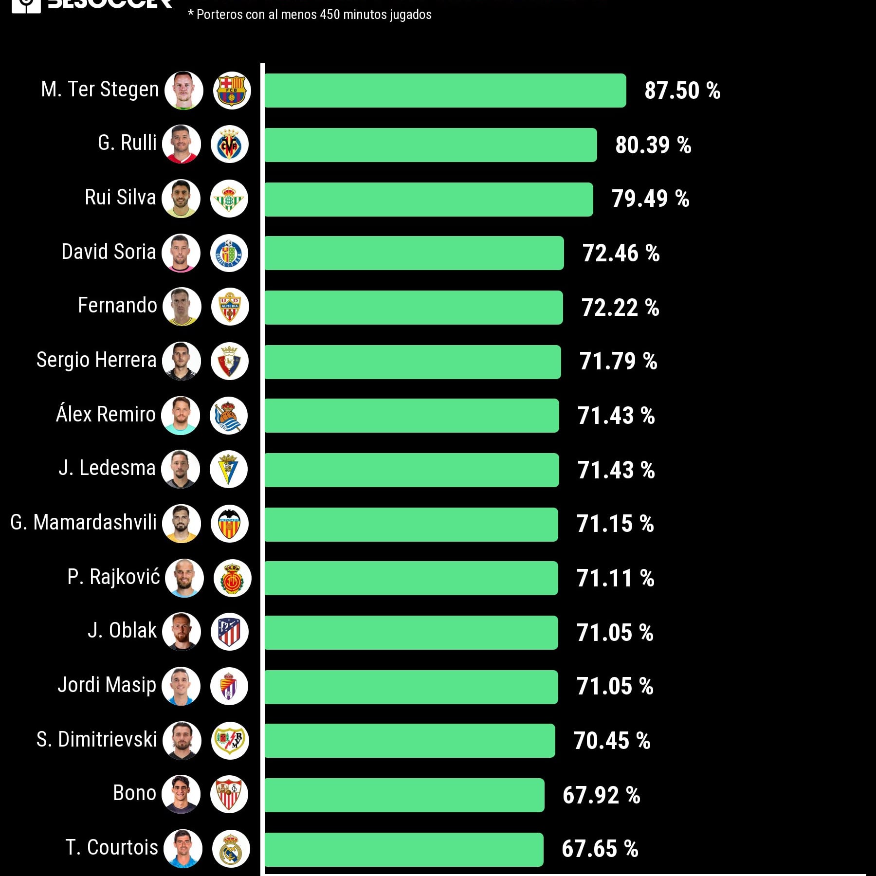 Rui Silva ha dejado la portería a cero seis veces en los 12 partidos que ha jugado esta campaña, lo que ofrece un promedio de imbatibilidad del 50 por ciento. Es decir, no encaja en uno de cada dos encuentros con el Betis gracias a sus 2,82 paradas decisivas por encuentro. Además, en la comparativa con Claudio Bravo, el meta portugués presenta los mejores porcentajes en remates de corta y de larga distancia. En este último parámetro, en concreto, presenta 1,25 intervenciones por partido a tiros lejanos con un 85 por ciento de efectividad.
