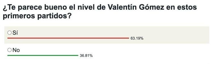En Estadio Deportivo hemos querido preguntar a la afición bética por su impresión sobre Valentín Gómez en estos primeros encuentros como jugador del Real Betis. La respuesta de los aficionados verdiblancos ha sido bastante positiva. El 63,19% de los votos creen que su nivel en su inicio con el conjunto heliopolitano es bastante bueno. El 36,81% restante piensan que sus actuaciones no han sido de un nivel apropiado para la entidad. De momento, en sus primeros meses como jugador del Betis ya parece haberse ganado a gran parte de la afición y, además, su rendimiento viene en línea ascendente en los últimos partidos.