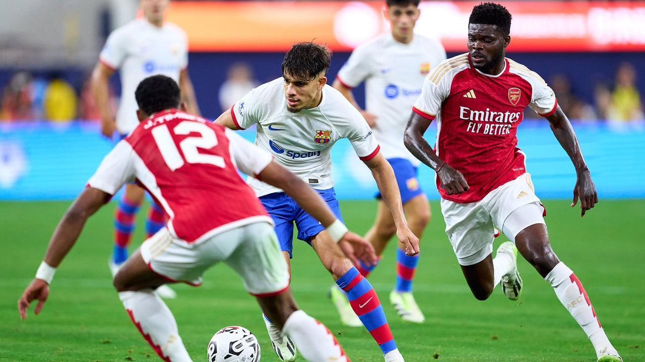 El atacante criado en Elche, entre los jugadores del Arsenal Jurrien Timber y Thomas Partey.FCB