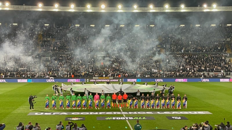 ¡Saltan los jugadores al césped! ¡Lleno absoluto en el Estadio Dom Afonso Henriques! Se escuchan con fuerza los 1.500 aficionados verdiblancos mientras suena el himno de la Conference League.