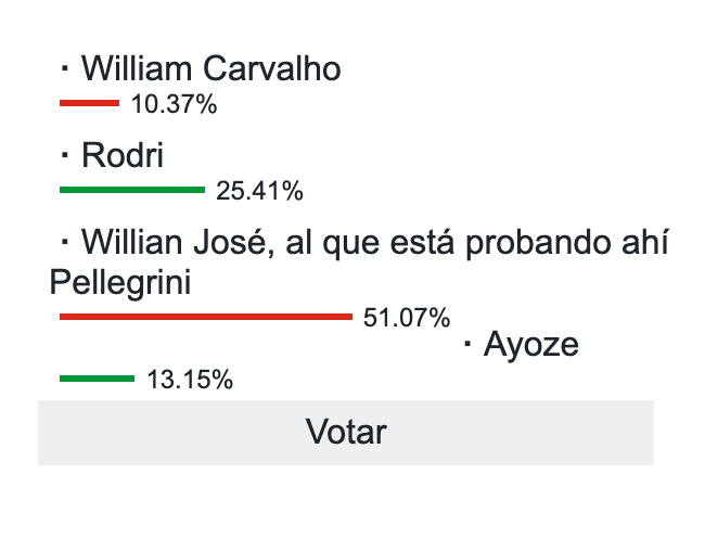 Con Fekir lesionado hasta noviembre y Canales enfilando la puerta de salida en dirección a Monterrey, salvo fichaje en la demarcación del '10', a Pellegrini se le reducen las opciones ahí a William Carvalho, Rodri, Ayoze y el propio Willian José, con diferencia la alternativa que más convence a los participantes en la encuesta propuesta por ESTADIO Deportivo. Un 51,07% suscribe que el ex de Wolves, Las Palmas (los canarios pensaron en recuperarlo, pero no han movido ficha, y allí sí se iría) y Real Madrid Castilla sea el director de orquesta, por detrás del punta, más del doble que los que apoyan al canterano de Talayuela como sustituto del campeón del Mundo.