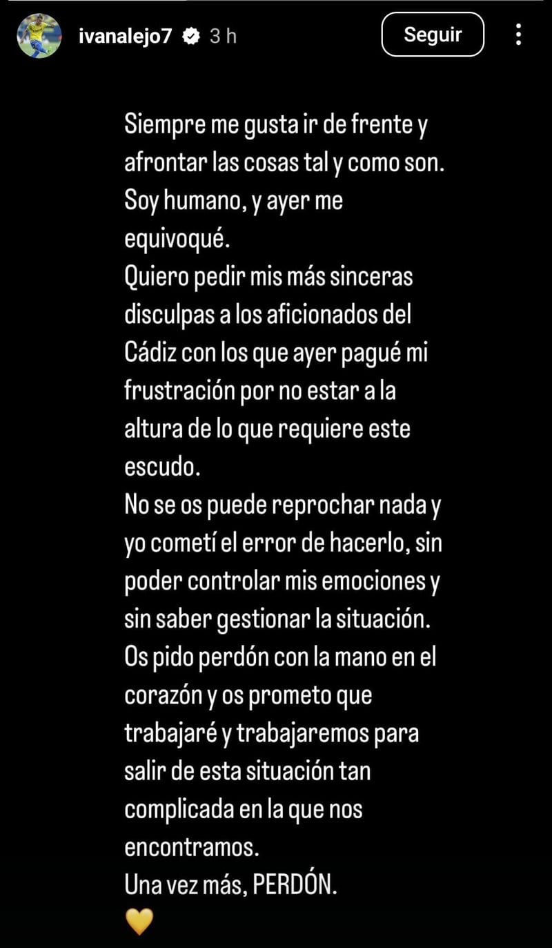 Esta situación de Iván Alejo no es la primera vez que se repite, ya que en más de una ocasión ha tenido problemas con la grada y posteriormente ha tenido que pedir perdón por sus actuaciones bochornosas. La afición amarilla está cansada ya de este tipo de actitudes, pese a que en momentos puntuales es de los pocos jugadores que lo intenta, mostrando su desborde y una facilidad pasmosa en sus carreras, pero después de que se repitan estas situaciones, el cadismo sigue sin estar contento con sus acciones. Nada más finalizar el partido, el jugador vallisoletano pidió disculpas a la afición del Cádiz tras lo acontecido, mostrando su arrepentimiento y asumiendo su error: "Siempre me gusta ir de frente y afrontar las cosas tal y como son. No se os puede reprochar nada y yo cometí el error de hacerlo, sin poder controlar mis emociones y sin saber gestionar la situación. Os pido perdón con la mano en el corazón y os prometo que trabajaré y trabajaremos para salir de esta situación tan complicada en la que nos encontramos”, declaraba el futbolista.