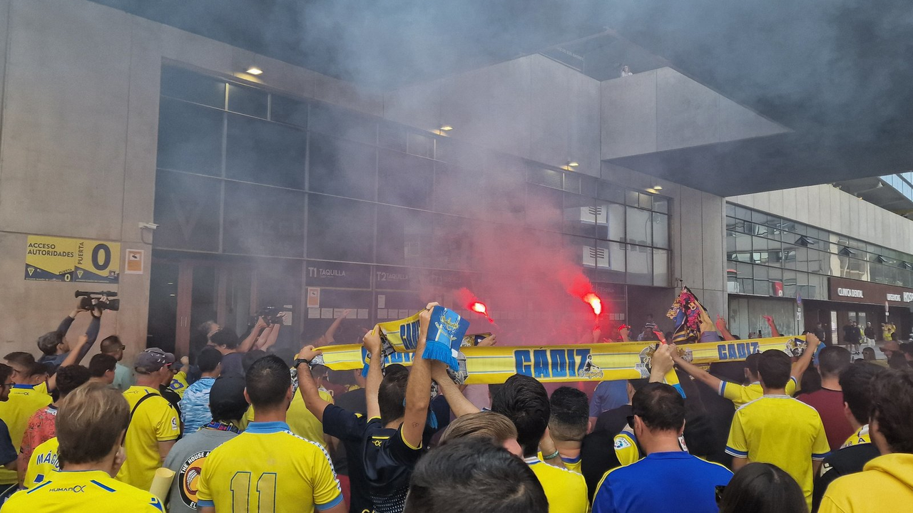 A pesar de que la afición del Cádiz, o una parte de ella, cree que el conjunto amarillo jugará la próxima temporada en Segunda División y así protestaron por ello en la previa. Una vez que los cadistas pisaron el Nuevo Mirandilla, animaron sin parar para llevar en volandas a los suyos de cara al triunfo.