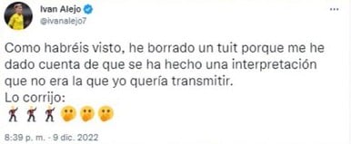 El defensa cadista colocó tres emoticonos de un bailarín, seguidos de dos monos tapándose la boca. Una mofa hacia el madridista que apenas duró 15 minutos en la red del pajarito azul. A los minutos colgó otro tuit intentando justificarse: “Como habréis visto, he borrado un tuit porque me he dado cuenta de que se ha hecho una interpretación que no era la que yo quería transmitir. Lo corrijo:”. La corrección consistió en cambiar los dos monos, por tres caritas con la mano en la boca.