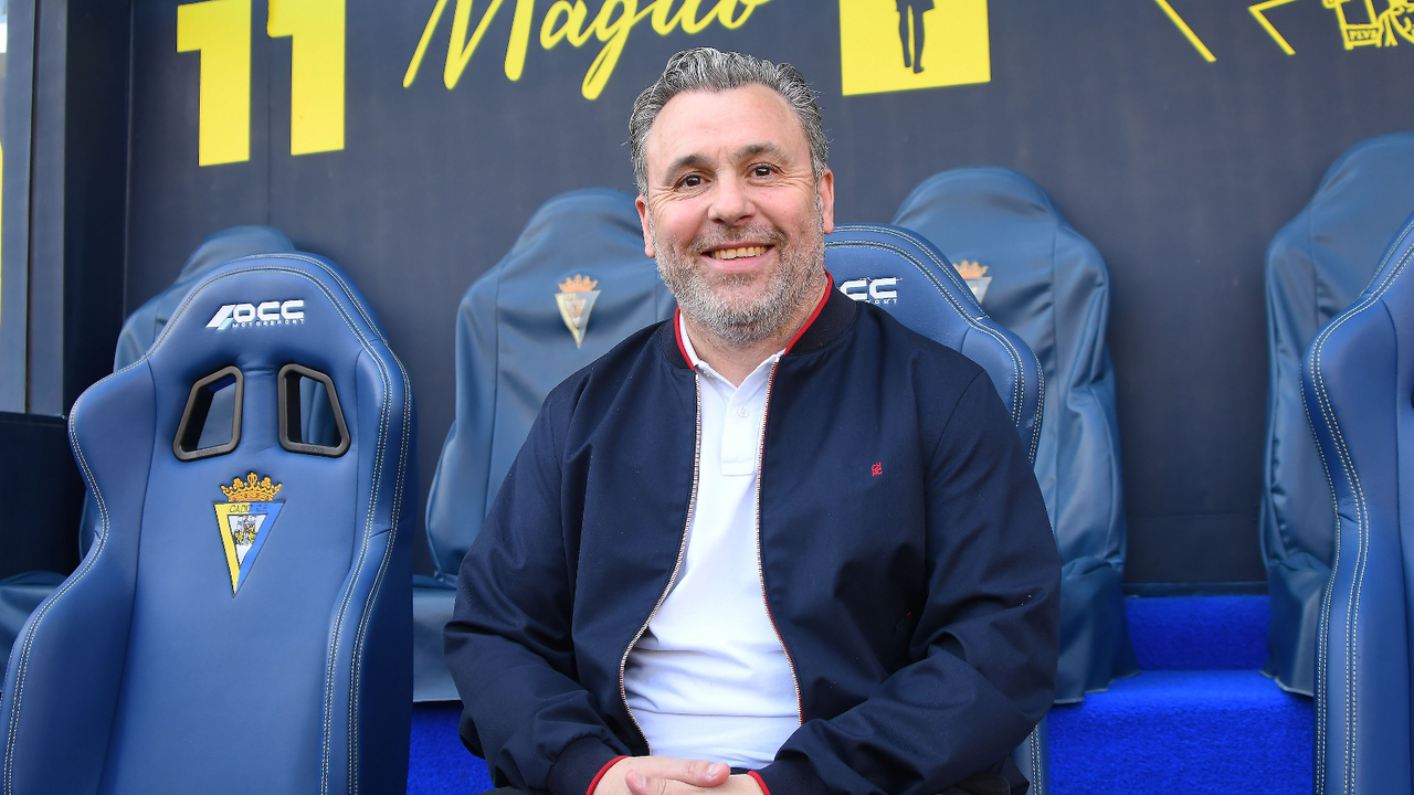 Sergio González posa sonriente en el banquillo deol Cádiz@Cadiz_CF