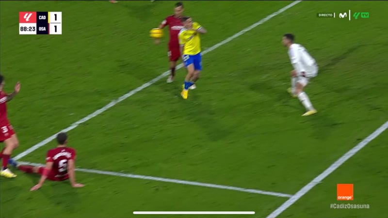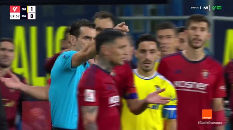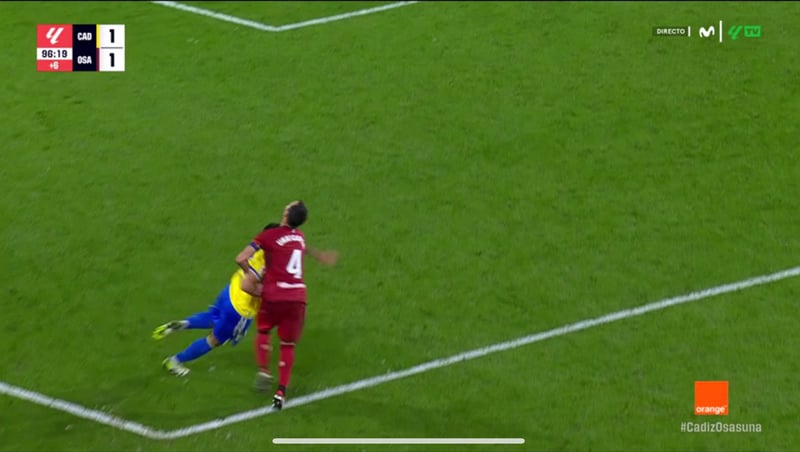 Todo se hace conforme al reglamento, pero, como ocurriera en el Mallorca-Sevilla del sábado, resulta increíble que unas manos para nada claras condicionen tanto un resultado. Pasó de nuevo en el Cádiz-Osasuna. Si en Palma anularon un gol al nervionense Pedrosa por el presunto roce de su disparo en el codo de En-Nesyri, que lo desvía a la red, en el Nuevo Mirandilla fue un leve toque con la punta de los dedos de Momo Mbaye a cabezazo de 'Chimy' Ávila que se iba al córner el que terminó convirtiéndose en penalti para que el conjunto pamplonés firmase el empate, a la postre definitivo. En la recta final, los locales pidieron la segunda amarilla y, por tanto, la expulsión de Unai García por una fea entrada a la altura del círculo central, así como dos posibles penaltis del central navarro. También se solicitó otro de David García, aunque aquí el balón le rebota claramente en el pecho.