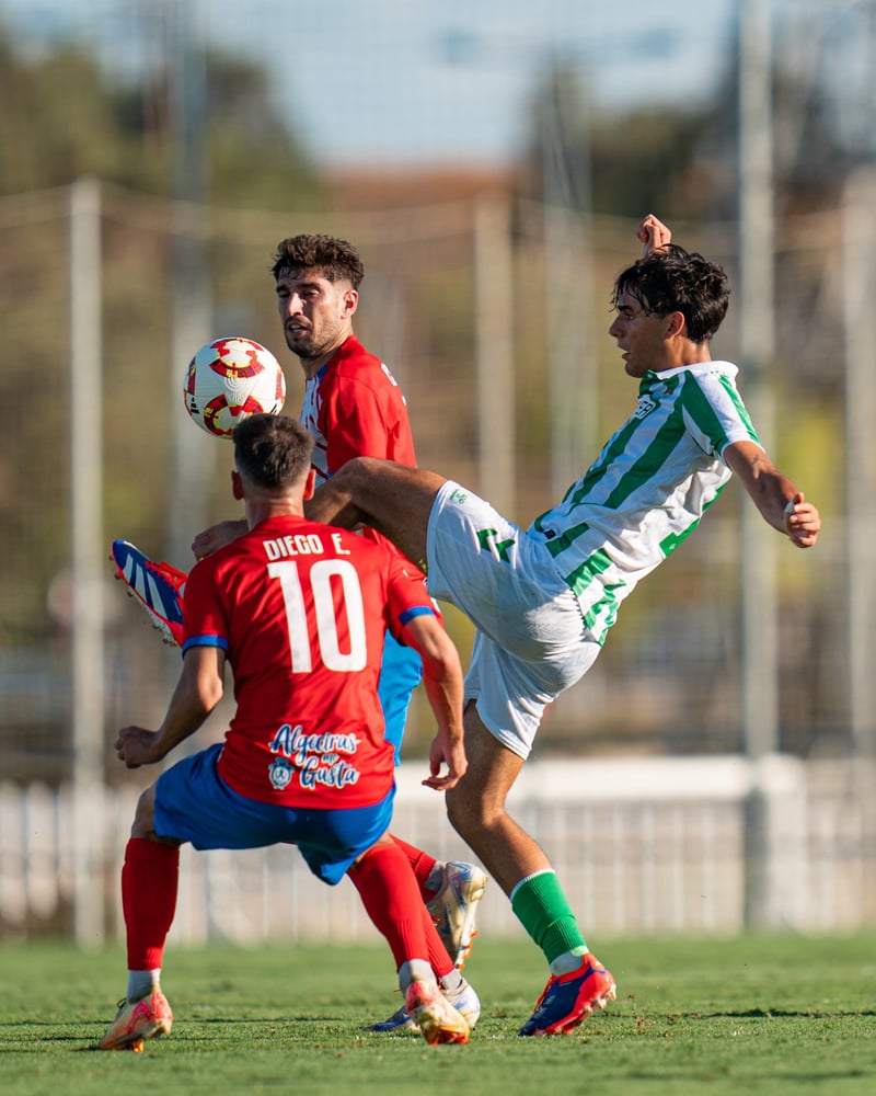 Los campogibraltareños tardaron apenas 17 segundos en tener la primera ocasión, fruto de una pérdida absurda de su anfitrión en la salida y de una rápida transición que terminó con disparo a bocajarro de Diego Esteban y la buena estirada de Guilherme Fernandes, una vez más salvador de los verdiblancos. No tardarían en responder los de Arzu, despejando con apuros Lucho García a córner un buen intento desde el vértice del área de Marciano Sanca y desviando a continuación el remate en semifallo de Rudy Kohon desde cerca. Poco a poco, el filial fue adaptándose al verde de la Ciudad Deportiva Rafael Gordilla, un escenario desconocido y un exilio obligado por el trabajo vespertino de su primer equipo en Los Bermejales y la negativa rojiblanca a retrasar la hora del choque. Sin llegadas tan nítidas como las apuntadas, Mateo Flores e Ismael Barea manejaban el tempo del choque, percutiendo por los costados y asumiendo riesgos atrás.